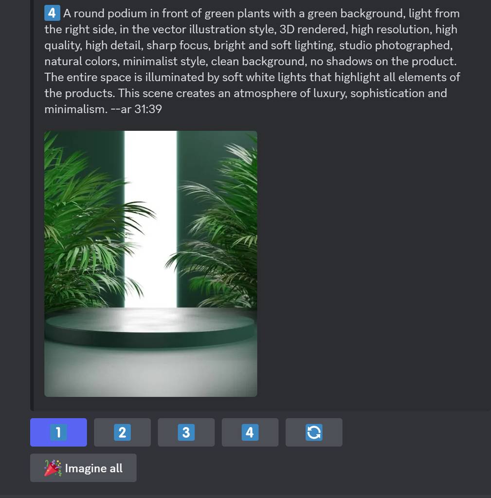 找一张想要的风格背景图,只要风格相似即可,因为MJ会对图片进行重绘的。当然,你可以直接用MJ直接生成。 例如我想要一个绿色的摄影台,有光影和棕榈叶,那么提示词可以这样写: