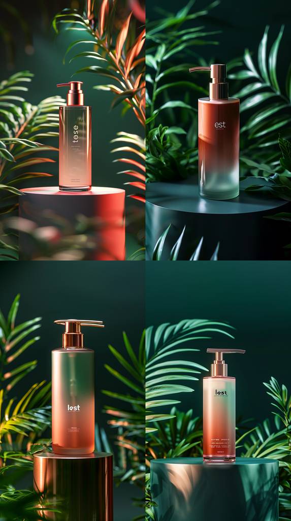 **A bottle of facial wash with the text "est" on the body written in English and Japanese characters, with an orange gradient color on a black background, and a metal pump head. The appearance design features a high-end texture and soft lighting. It has two metallic edges at both ends, giving it an elegant feel. With rose gold as its main tone, it creates a warm atmosphere. This product uses pink glass material to create a sense of luxury. In contrast, there is space around the top for the brand name and logo decoration in the style of minimal editing of the original text. A round podium in front of green plants with a green background, light from the right side, in the vector illustration style, 3D rendered, high resolution, high quality, high detail, sharp focus, bright and soft lighting, studio photographed, natural colors, minimalist style, clean background, no shadows on the product. The entire space is illuminated by soft white lights that highlight all elements of the products. This scene creates an atmosphere of luxury, sophistication and minimalism. --cref [https://s.mj.run/Fj7GCv3sv4c](https://s.mj.run/Fj7GCv3sv4c "https://s.mj.run/Fj7GCv3sv4c") [https://s.mj.run/oSIWHUMF0yk](https://s.mj.run/oSIWHUMF0yk "https://s.mj.run/oSIWHUMF0yk") --ar 9:16 --cw 100 --style raw**