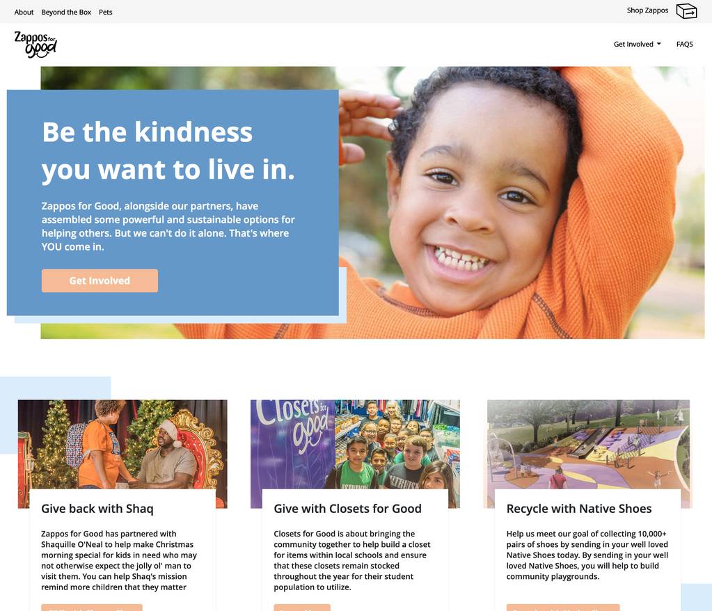 例如,Zappos的“关于我们”部分包含了一个名为“Zappos for Good”的子类别,在其中概述了该公司在环境可持续性和回馈弱势群体等重要社会话题上的立场。