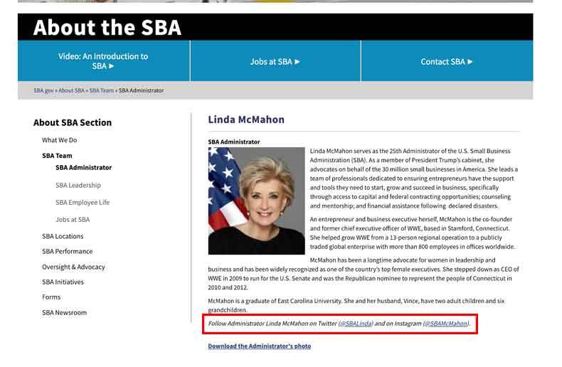 小企业管理局的领导鼓励用户在社交媒体渠道上关注并与他们沟通。