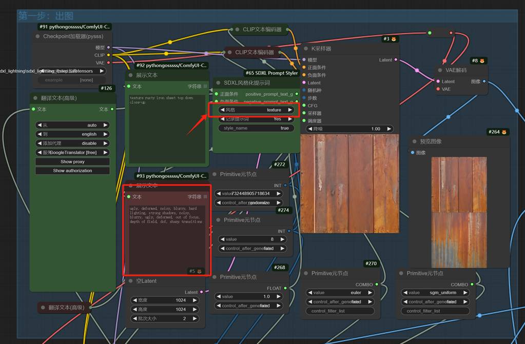 首先是文生图,需要选择SDXL风格的texture,这样出的图才大概率符合贴图的制作要求。为了提升出图的速度,我们使用字节出的lightning 8步模型。 至于提示词,使用了翻译节点,直接输入中文即可,然后通过文本拼接,固定提示词和反向提示词,即可实现输入对象,即可生成相对于的贴图。