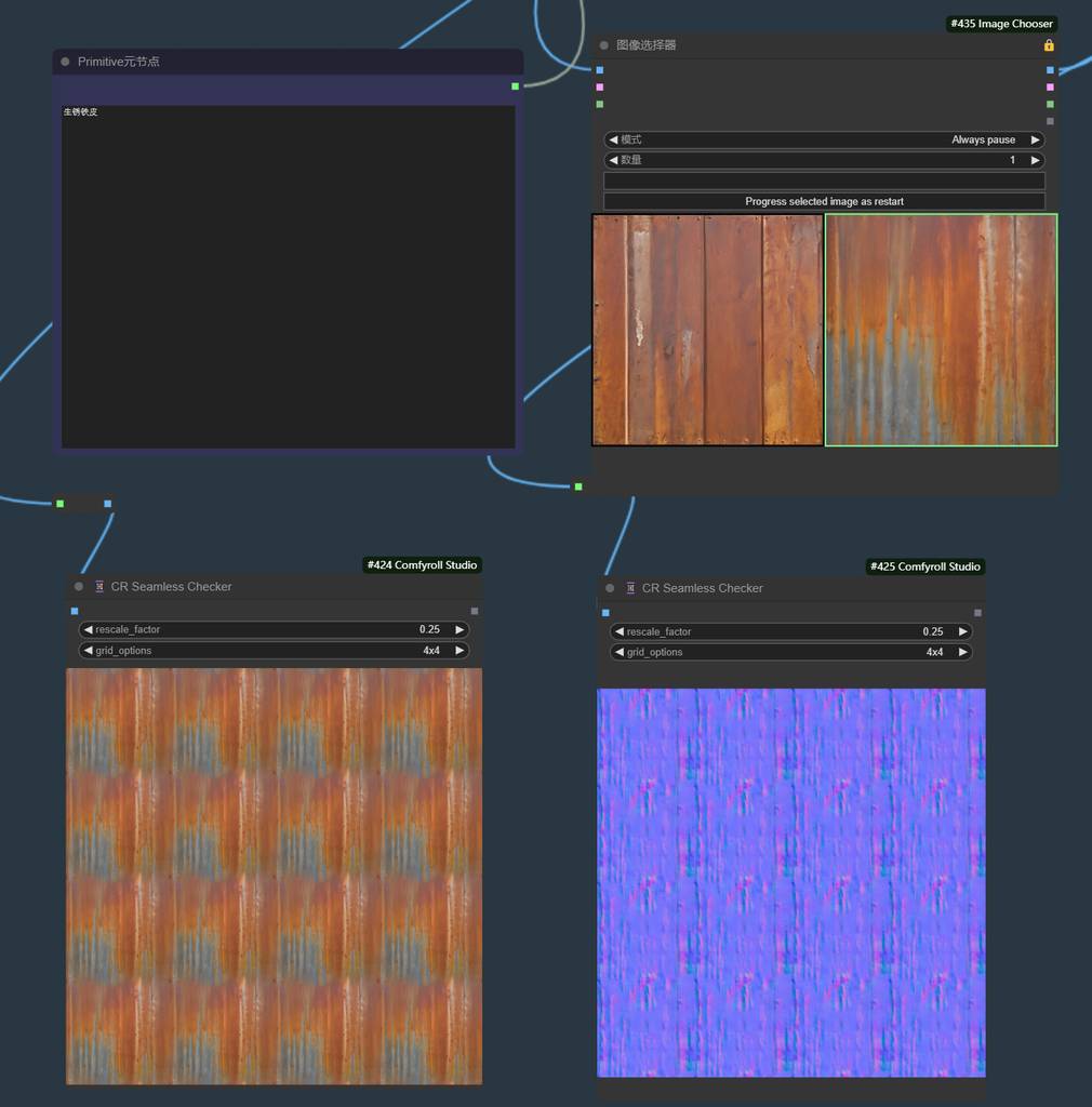 我们为了方便,单独将主提示词抽离出来。同时加入了选择图片节点,当生成合适的图后,在进行通道图处理。 还加入了CR的无缝贴图检查器,方便看贴图是否四方连续。