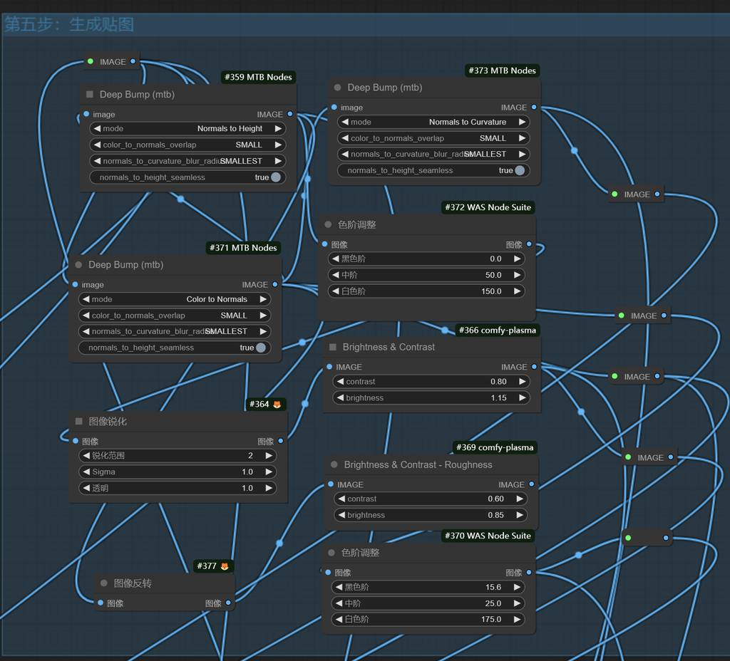利用mtb节点,生成各个通道的贴图。生成原理,大家可以看图片,有专门的生成高度图、法线等图的功能,直接使用即可。当然,这里还需要做一些对比度、锐度、色阶等处理,这里大家根据自己需要调整即可。