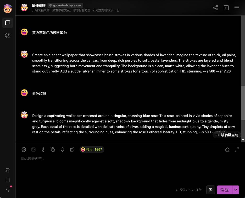 大致意思是告诉GPT,你是一个壁纸设计师,根据我们的输入,扩展提示词,并加上附加词。 大家可以自行选择用什么GPT工具。我使用的ChatGPT 4,测试下来,效果还不错,比其他语言模型要好。