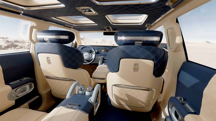 内饰没有采用高光饰板和炫酷却脆弱的展示车风格,而是巧妙融合了高端与耐用的材料,以优雅的米色和天蓝色双色调呈现。模块化储物系统和四片式天窗则暗示这款概念车并非仅为展厅而生,而是为真正的野外探险而设计。