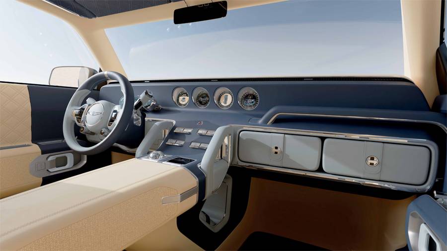 忘掉 GV 80 或 GV 70 那流畅的线条吧。X Gran Equator 展现出更为大胆的姿态,摒弃了超大格栅设计,采用了近乎无缝的前脸,并进一步强化了创世纪标志性的双线灯光设计,灯光线条如今戏剧化地环绕整个车身。车身比例毫不掩饰地被放大——长引擎盖、紧凑的后悬以及隐藏式后门把手,共同塑造出一种粗犷却不失精致的轮廓。甚至连配备无品牌全地形轮胎的 24 英寸 beadlock 轮毂,也拒绝随波逐流。