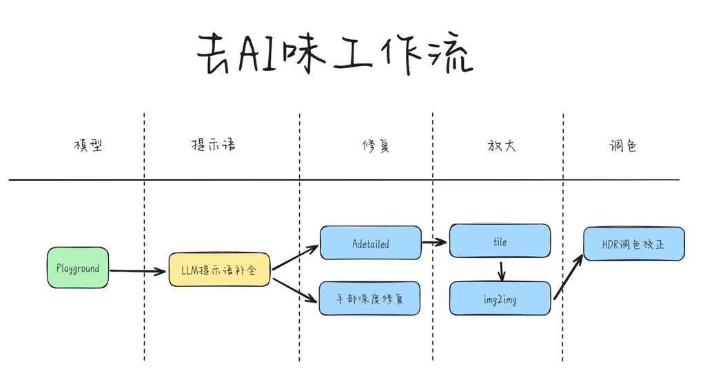 今天,我们就从这几个方面着手,通过添加节点处理的方式,让SD生成的图像摆脱“AI味”,尽管完全去除是不可能的,但我们可以尽力追求更自然的效果。