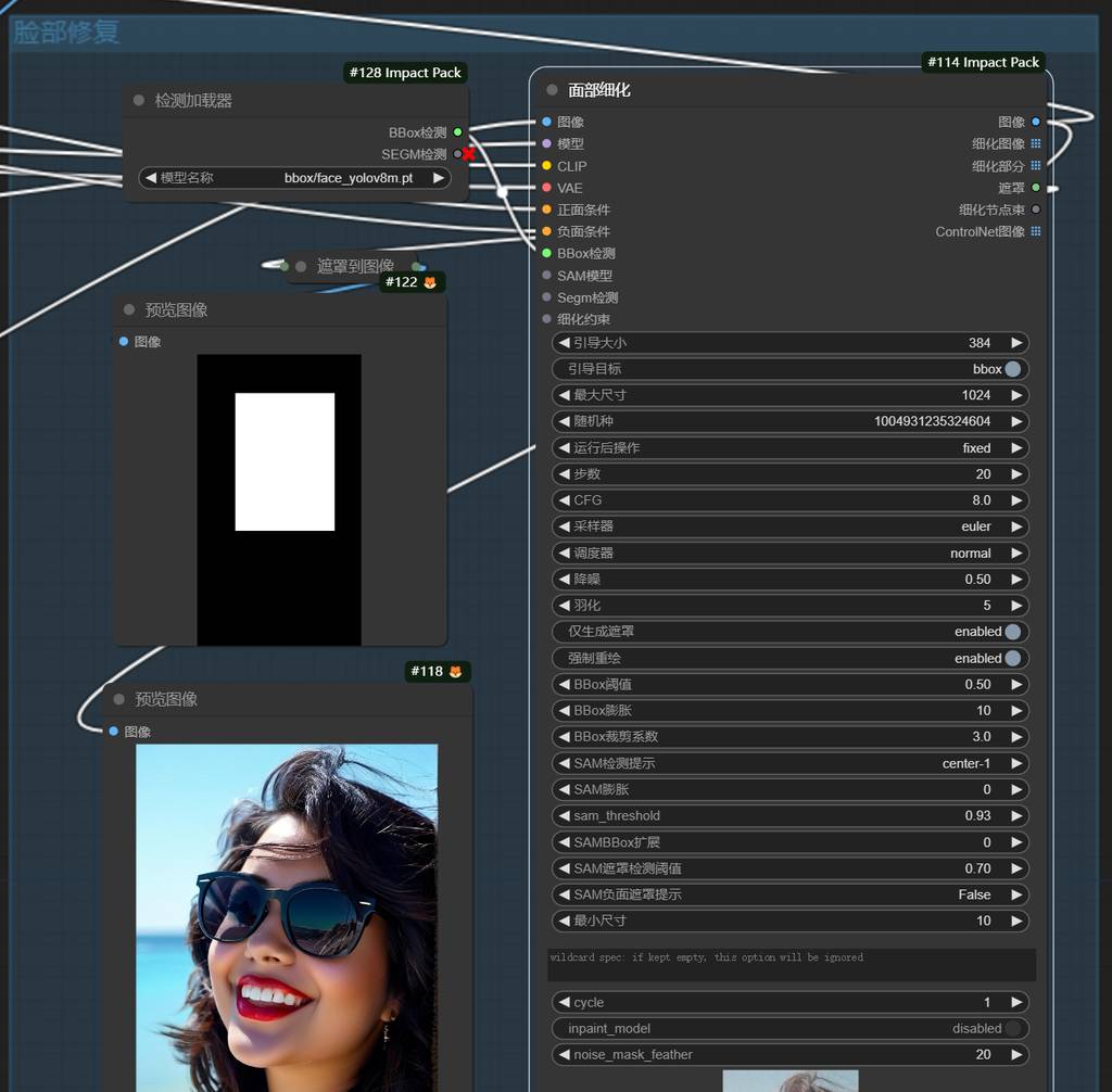 AI在处理手部与脸部细节方面存在不足,我们可以通过增加节点来针对性地修复这些问题,我这里只用了脸部修复。