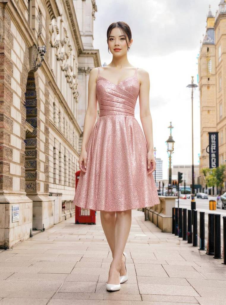 - The dress is a short, flared style with a shiny, glittery texture in a soft pink or rose gold color.