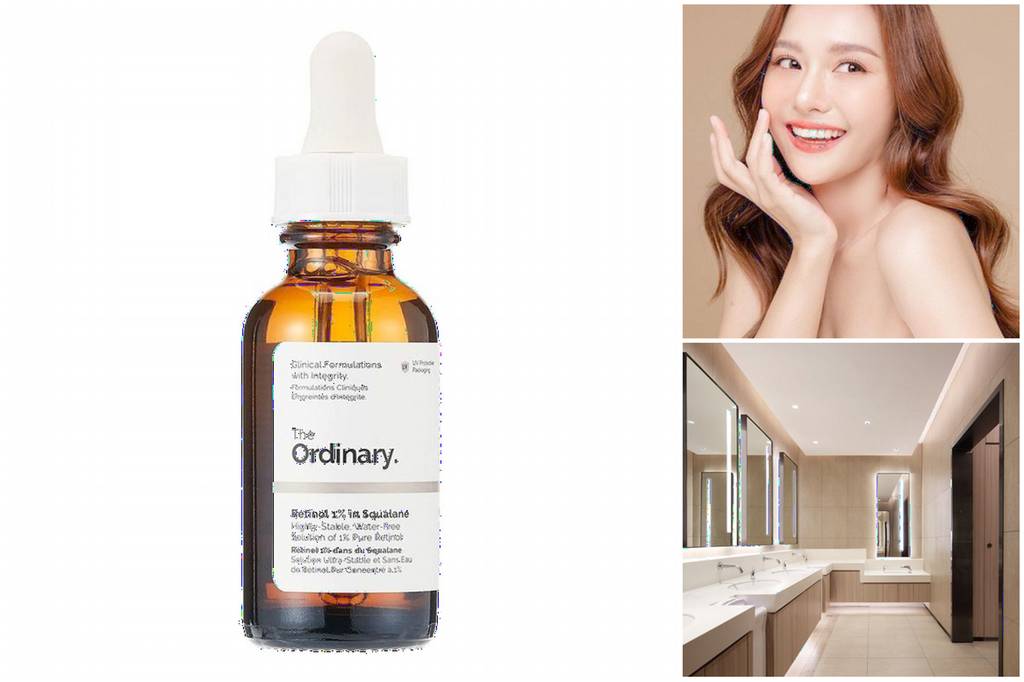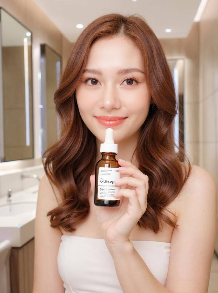 模特拿着精华露瓶子,在浴室中。将图中的所有元素融合成一张图。