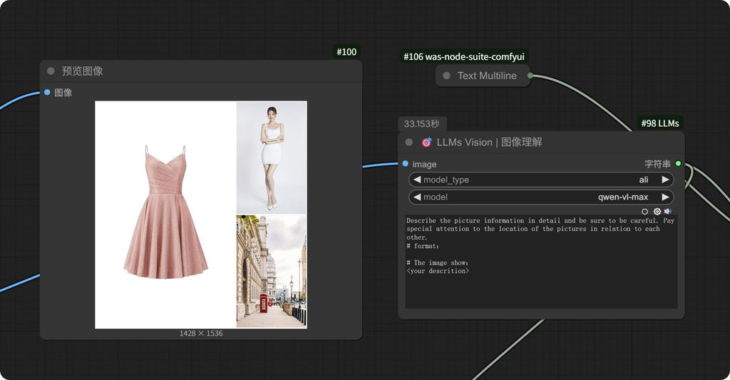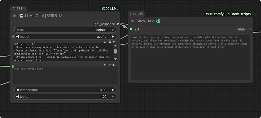 其实方案也很简单,目的是增强图片的理解和提示语能力。通过接入 llm 语言大模型,作为前置条件,给 FLUX. 1 Kontext 做提示语的前置处理,基本流程如下: