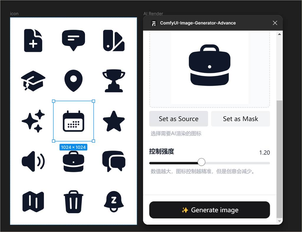 使用方法非常简单,选择要重绘的图标,点击 set as source,然后点击生成,等待结果就行!
