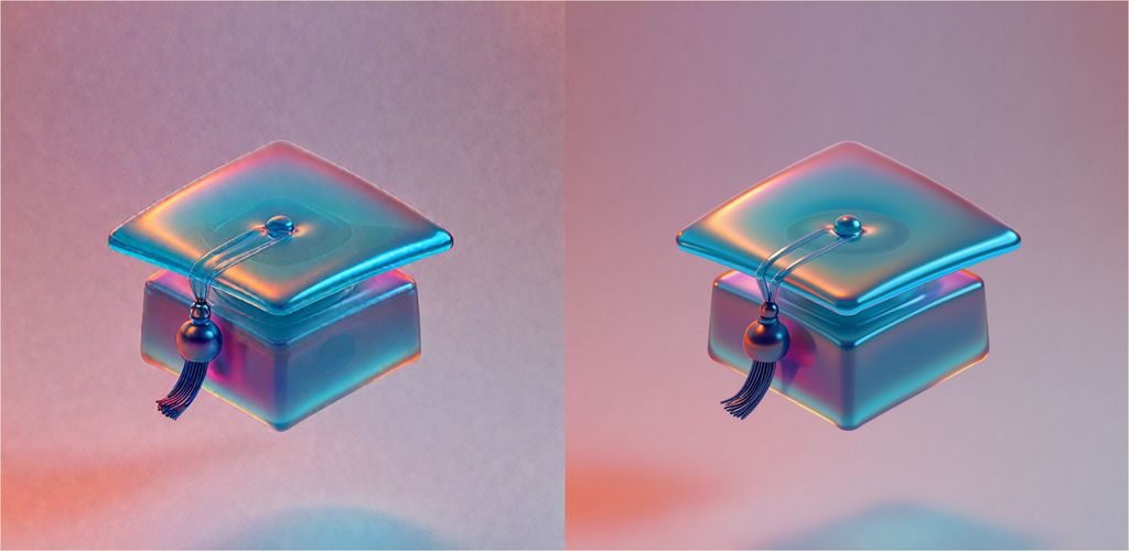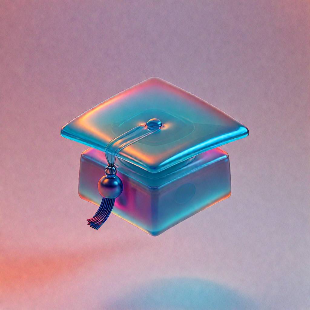 dispersion_glass, This is an icon of a graduation cap. It has a square, flat top with a tassel hanging from the center. The tassel is attached to the cap with a small circle, and it drapes down on one side. The cap itself is rectangular with a slightly beveled edge, giving it a three-dimensional appearance., 3D rendering, glass torus, floating, pink gradient background, blue gradient background
