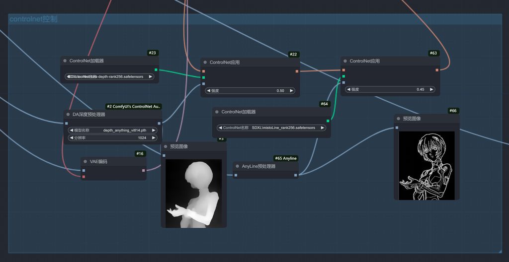 工作流的核心是将输入的图,用语言大模型反推,然后加上SDXL风格提示,在串联“真实”提示语。然后通过mistoLine和Depth控制形态。