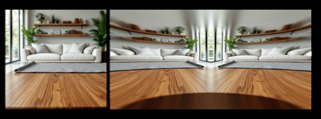 A close-up shot of the wooden coffee table with a grey linen place mat on it, in front of a white sofa and shelves with books and plants. The focus is on the detailed texture of the wood grain and fabric, set against soft natural light creating gentle shadows. A blurred background reveals an open space filled with greenery and sunlight streaming through large windows. This composition creates a serene atmosphere perfect for home decor photography, highlighting both wood and fabric textures in the style of minimalist interior photography.