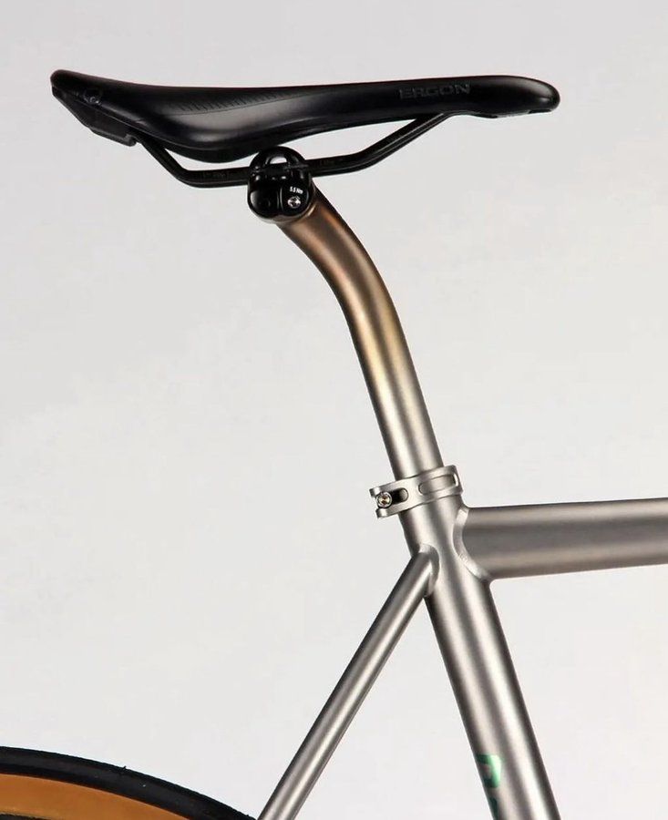 钛阳极氧化处理+浮油工艺,用在自行车的钢管上,车架的线条流畅,表面呈现出工业拉丝的效果,这暗示使用了高强度材料,很可能是高等级的铝合金或者钛合金。这样的材料选择不仅减轻了重量,而且保证了耐用性,还提供了一定程度的柔韧性以增加骑行舒适度。