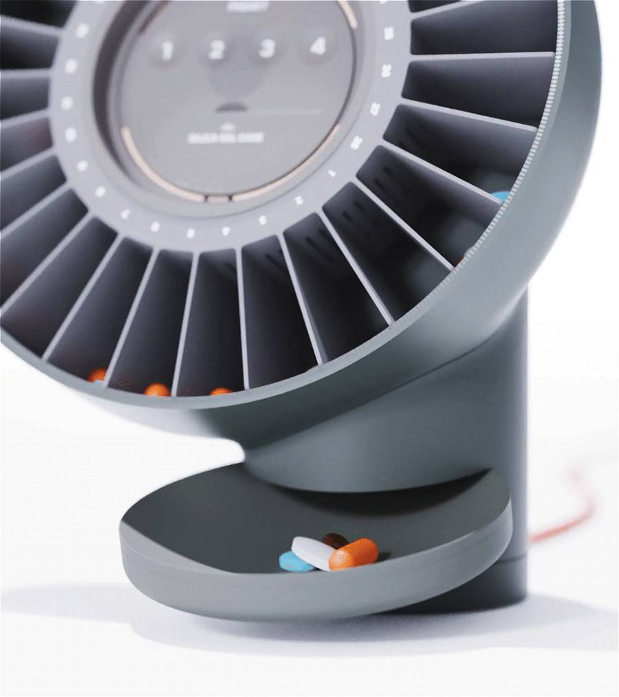 Chanho Ju的设计优雅地解决了这个问题,将药盒与一个在家居中已有数百年历史的物品——时钟相结合。但这不是一个普通的时钟。其极简主义设计,特征是一个显示时间的LCD屏幕,线条简洁流畅,巧妙地隐藏了其双重功能。当服药时间到来时,时钟会展示其隐藏的隔间,每个隔间都精确装有每天的剂量,确保遵守药物时间表 as simple as checking the time.