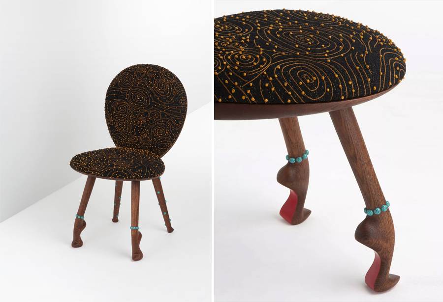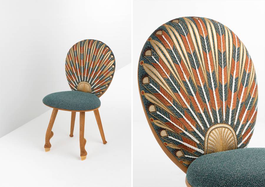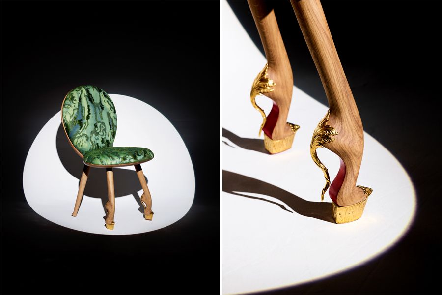 这一系列椅子由一群精选的法国工匠手工制作,他们擅长传统和高级定制工艺。这包括以奢侈品时装屋著称的刺绣工坊Maisons Vermont和Lesage Interieurs,以及克里斯提·鲁布托自己的鞋匠Minuit Moins 7,他们精心处理了座椅的软垫工作。约万诺维奇分享了这种设计过程严格要求的心得:“设计一把椅子是非常受限制的练习:总体尺寸和角度都非常固定。设计一双鞋更是受限制且技术性更强。在这两种情况下,都有巨大的创意空间,而在两种情况下,依赖精湛工艺至关重要。”