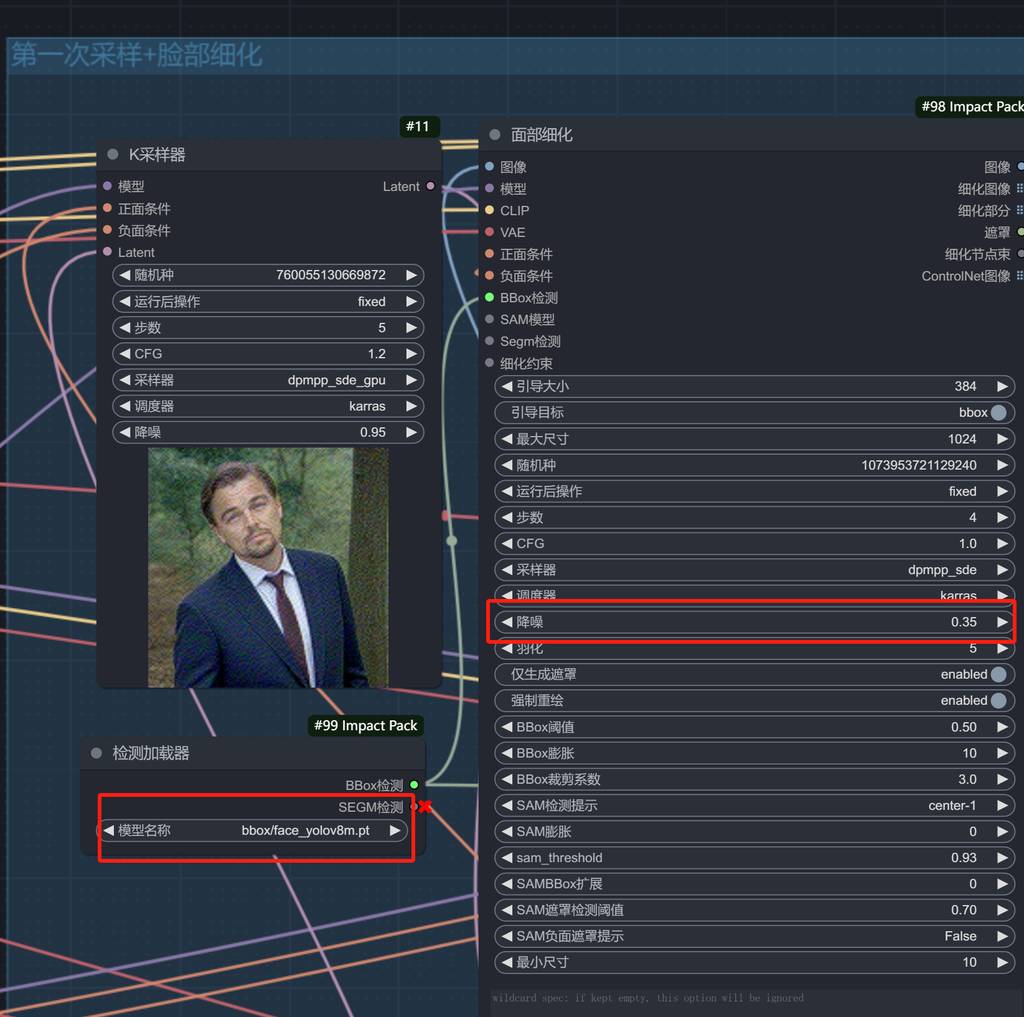 脸部细化节点是集成在Impact Pack节点里面的Face Detailer,可以修复脸部不合理的结构。 这里需要选择一个合适的模型作为检测脸部特征,同事降噪不要开的太高,我这里稍微高一点,0.35.