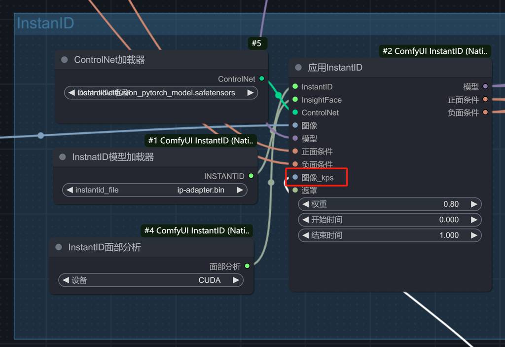 这里用到了InstanID。这个插件安装有点难度,有空开一期专门讲讲。 这里需要讲一下的是,kps输入点,这里的输入是脸部关键的特征,跟openpose的脸部特征类似原理。