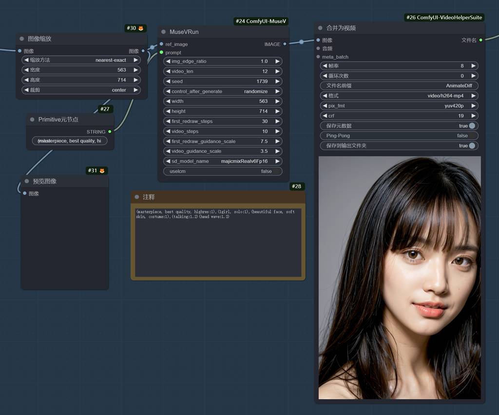 直接用了节点作者提供的工作流,大家看看。注意,这里要对图片进行缩放,不然出的视频比例跟预想的会不一致,当然,你也可以改MuseV的默认尺寸,但建议还是用默认的更好。