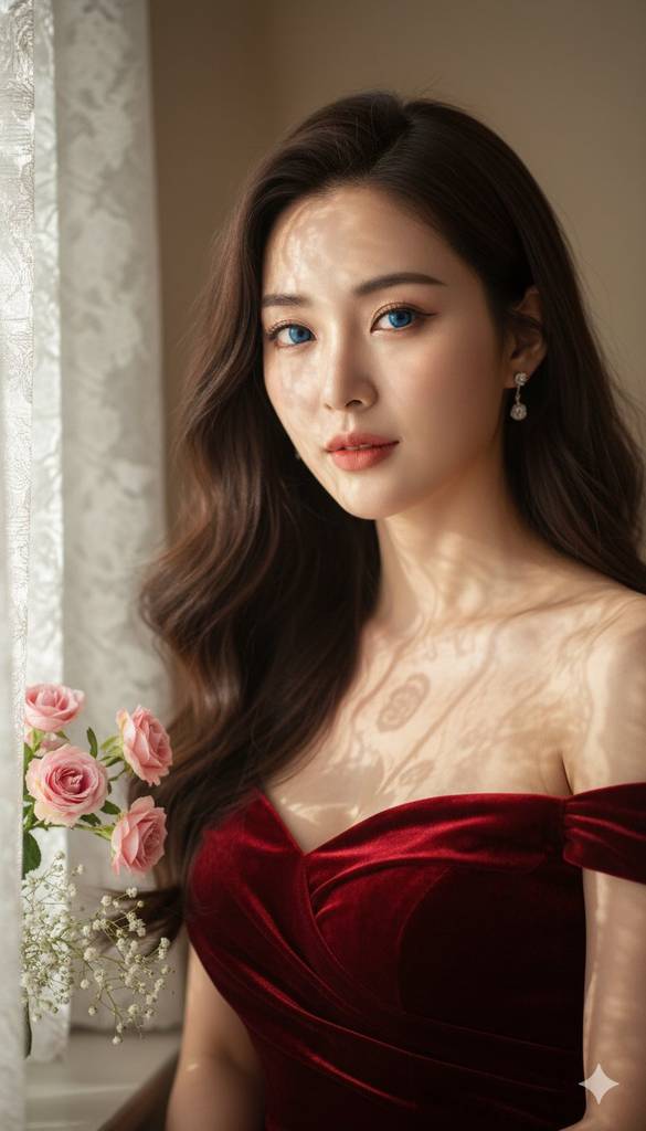 作品赏析:正红色露肩裙与蓝色眼眸形成视觉焦点,蕾丝窗帘的光影投射在面部与肩部,左侧玫瑰与满天星点缀,整体营造柔和浪漫的优雅氛围。