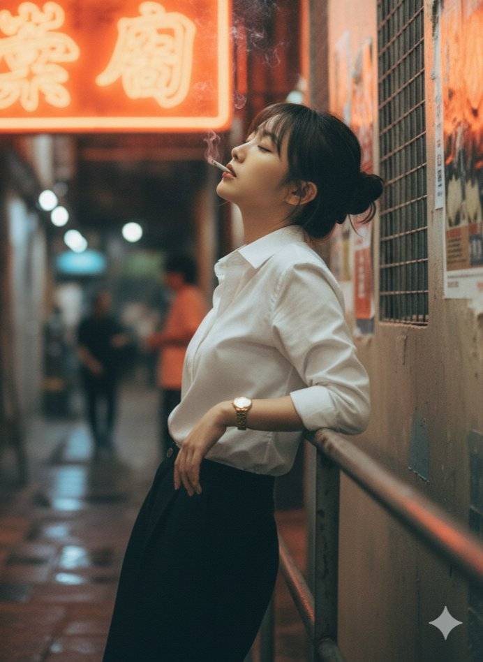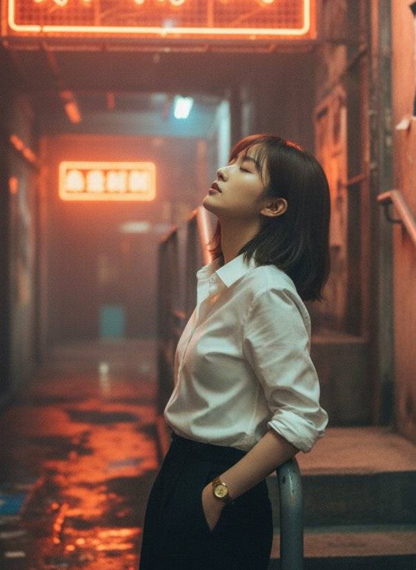 A cinematic portrait of a young East Asian woman in a narrow Hong Kong-style alleyway inspired by Kowloon Walled City, recreated with 95% similarity to the reference image in composition, lighting, and environment. The scene unfolds in a dim urban alley lined with aged concrete walls, torn Chinese posters, and a large red-orange neon sign glowing in the background. The neon is mounted on a rusty metal grid, casting its warm light across the rough concrete and a narrow stairway landing nearby. The woman stands leaning casually against a metal handrail, not the wall — her right hip and elbow resting lightly on the railing. Her head tilts back slightly toward a cool white lamp above, eyes closed, wearing a calm, introspective expression as if lost in thought. She has a modern Korean hairstyle — shoulder-length, slightly tousled with a side part. Her outfit is a crisp white button-up shirt tucked into high-waisted black trousers, complemented by a gold wristwatch on her left wrist. Lighting setup: Main light: strong orange-red glow from the neon sign behind her. Secondary light: a cool white lamp above her head, creating a faint halo and defining her facial contours. Background: partially blurred with warm and cool contrasts, reflecting off wet walls. Camera details: Medium shot (waist-up), taken from a slight low angle on the right front side. Shallow depth of field, focusing sharply on the woman’s face and torso. Frame includes the metal handrail, old posters, and the reflected neon glow. Atmosphere & tone: Cinematic realism, 8K film texture, analog grain. Mood: nostalgic, moody, Hong Kong 90s night aesthetic. Subtle haze in the air, wet concrete reflections, and grunge urban tone. Keywords: Hong Kong alley, Kowloon Walled City, neon glow, cinematic portrait, grunge realism, orange-red light, blue contrast, analog film, urban nostalgia, moody lighting.
