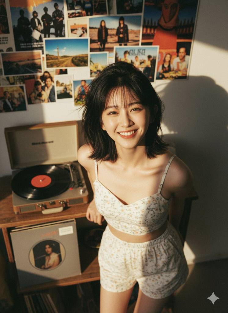 作品赏析:高角度俯拍捕捉短发女性的真实笑容,左上侧自然光打造戏剧性阴影,背景海报与复古唱片机丰富场景层次,暖调胶片颗粒增添复古质感。
