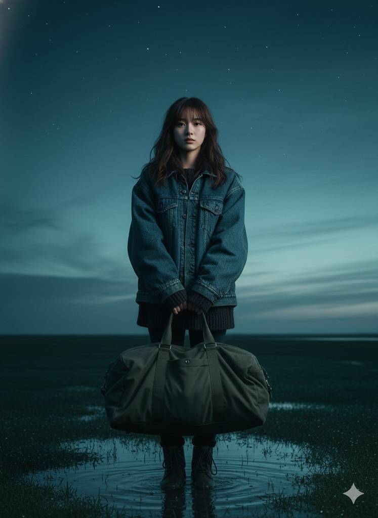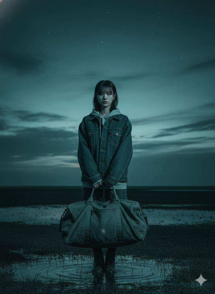 A solitary figure standing on wet grass at dusk, holding a large duffel bag by the handles. The scene is bathed in a cinematic teal tone deep, moody atmosphere with cool gradients across sky, water, and fabric. The person wears oversized layered clothing, textured denim catching the faint shimmer of low light. Horizon low, vast sky dominating the frame, filled with faint stars and soft cloud streaks. Reflected teal hues ripple across the shallow water around their feet. Light direction from camera left, sculpting subtle highlights on cheekbones, fabric folds, and the bag's contour. Quiet tension, still air, cinematic solitude. --no blur watermark text distorted faces logos -ar 4:5 --raw --stylize 1000