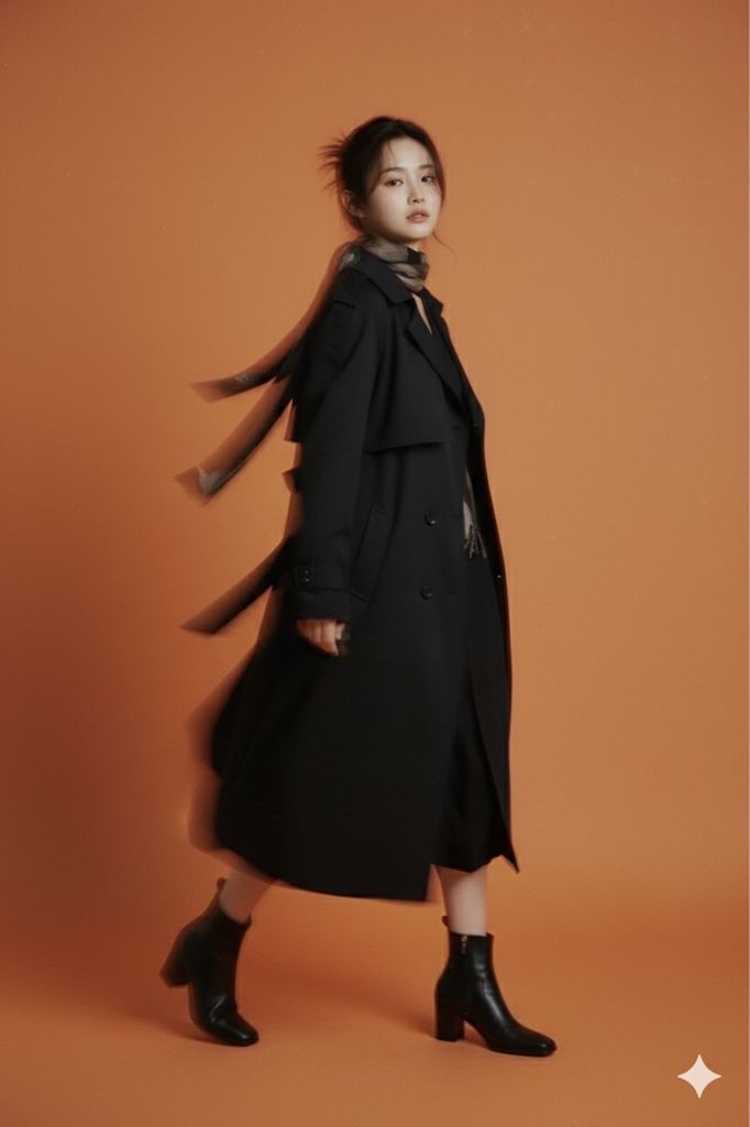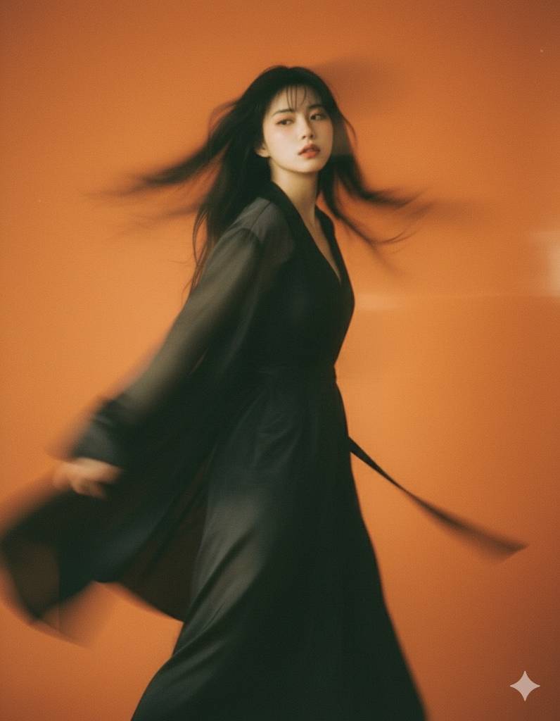作品赏析:工作室纯色橙背景聚焦主体,摇摄手法带来动态模糊效果,搭配褪色胶片质感,弱化细节的同时强化神秘女性的氛围感与视觉张力。