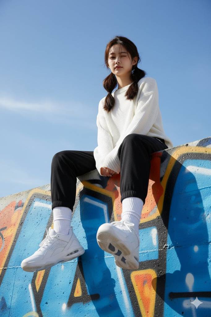 Stylish young woman (face from uploaded reference) sitting on graffiti-covered concrete wall. Oversized white sweater, black joggers, white socks, Jordan 34 sneakers. Low-angle shot with shoe sole in sharp detail, one leg hanging casually. Vibrant street art (blue, yellow, orange) and clear sky background. Natural daylight, crisp textures, editorial streetwear, wide-angle perspective. --ar 3:4
