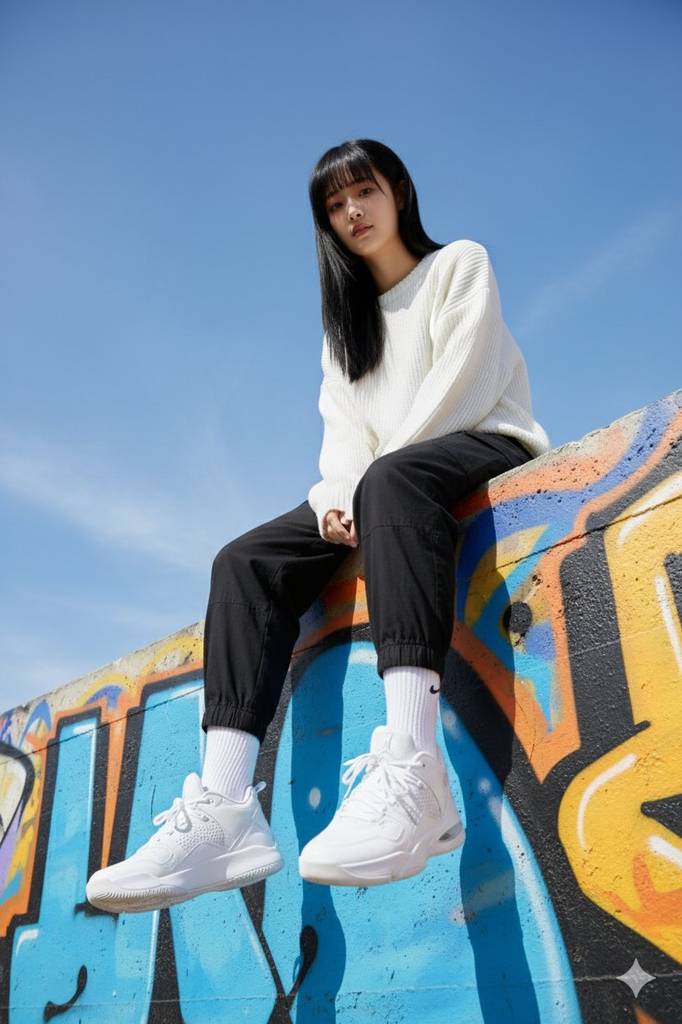 作品赏析:低角度特写突出乔丹34球鞋细节,涂鸦墙的蓝黄橙撞色与晴空形成鲜明对比,宽松穿搭与随意坐姿还原街头潮酷风格,广角视角增强场景代入感。