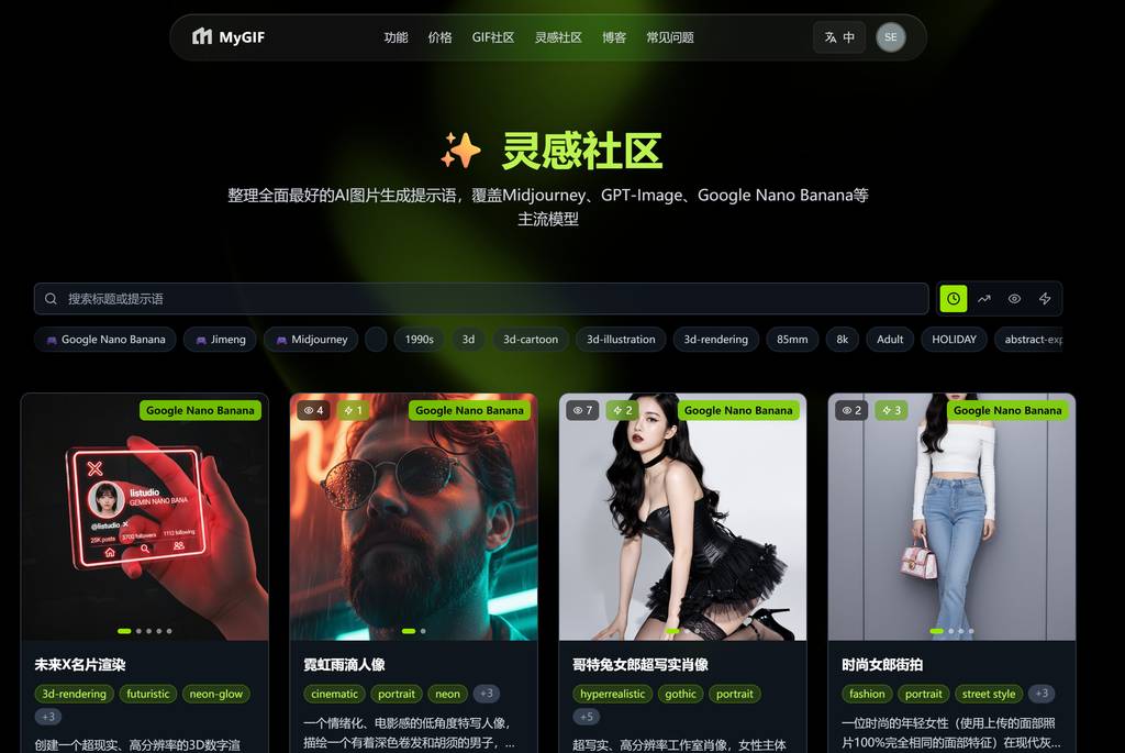 推荐一个实用网站:https://mygif.fun。该平台虽以GIF生成为核心功能,但同步提供大量高质量图片提示语,支持中英文切换,且提示语可直接复制,查看与使用都十分便捷。