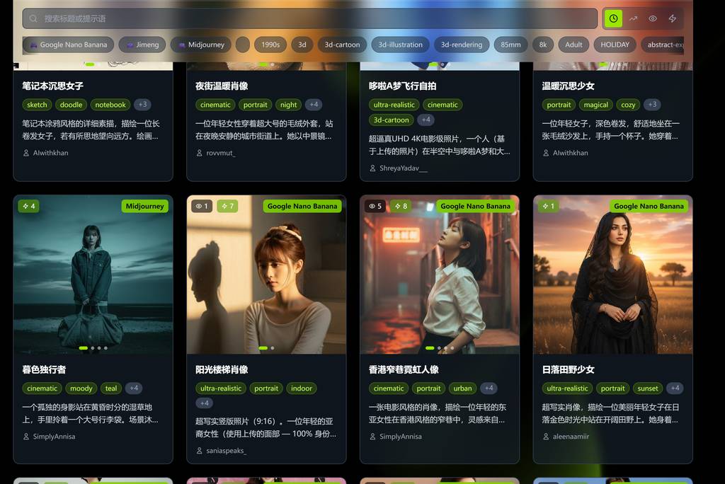 本次整理的提示语覆盖多个人像风格,来源包括Google nano banana、Midjourney及Seedreem 4.0平台,部分为原创优化,大部分源自行业优质分享,可根据实际需求调整使用。本期优先分享适用于Google nano banana平台的8组提示语,文末还会附上优质提示语获取渠道,助力高效出片。