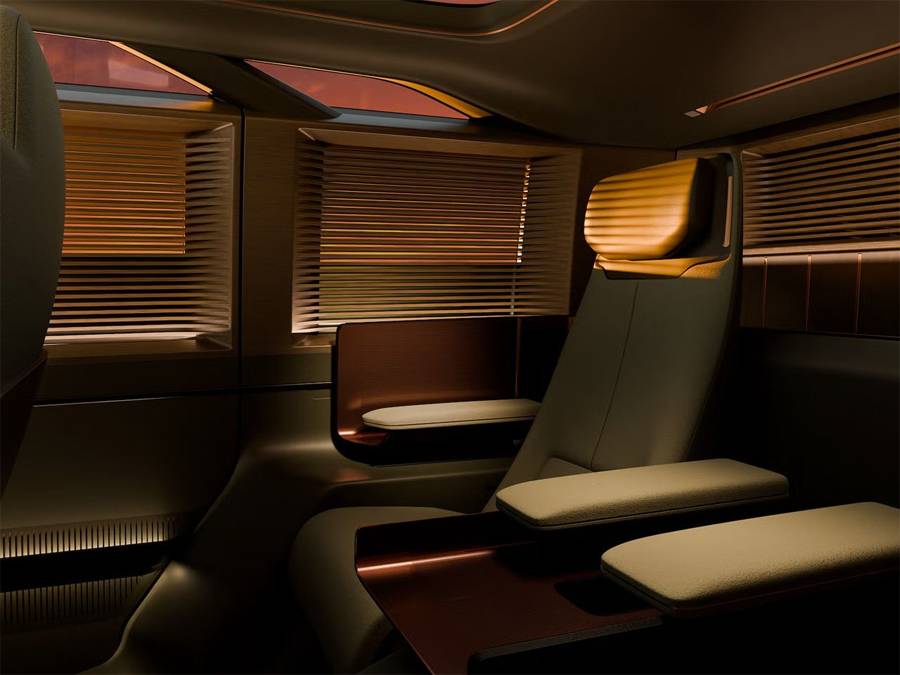它专为数字游民和豪华出行需求者设计,配备全景车窗、双天窗,前排座椅可旋转至朝向后方,停车时能形成社交聚会空间。车内更像是私人会客厅而非交通工具,光线充足,座椅可灵活调整——从独立船长椅变身可躺卧的睡眠模式。未来感轭式方向盘后方的曲面数字显示屏,让驾驶者(或更准确地说,乘客)能无缝连接车辆各项系统,同时保持座舱整洁有序。