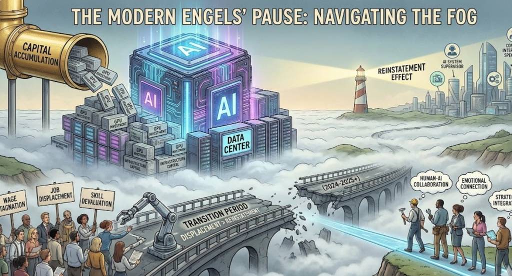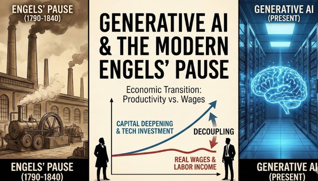 随着生成式人工智能(Generative AI)技术的迅猛部署,全球经济正经历一场深刻的结构性转型。宏观经济指标显示,尽管技术前沿的生产力潜力巨大,但实际工资增长与资本回报率之间出现了显著的脱钩现象。这一趋势与英国工业革命初期(1790-1840年)出现的“恩格斯停顿”(Engels’ Pause)具有惊人的相似性。本文旨在通过详尽的历史比较分析、现代数据挖掘以及劳动经济学理论框架,深入剖析当前技术周期的本质。分析表明,我们正处于一个由“资本深化”(Capital Deepening)主导的过渡期:企业的超额利润正被大规模重新配置用于构建昂贵的数字基础设施(如GPU集群和数据中心),而非转化为劳动报酬。与此同时,认知型任务的自动化导致了技能贬值和中产阶级岗位的空心化。尽管长期来看,技术进步有望通过“恢复效应”(Reinstatement Effect)创造新需求,但短期内的“置换效应”(Displacement Effect)占据主导地位,预示着未来数年甚至更长时间内,普通劳动者将面临议价权削弱和收入停滞的阵痛期。