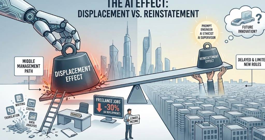 为了更深入地理解为什么AI会导致工资停滞和劳动力市场两极分化,我们需要引入著名经济学家达龙·阿西莫格鲁(Daron Acemoglu)和帕斯夸尔·雷斯特雷波(Pascual Restrepo)提出的“任务模型”(Task-Based Framework)。该模型认为,自动化技术对劳动力的影响取决于两种力量的博弈:“置换效应”与“恢复效应”。