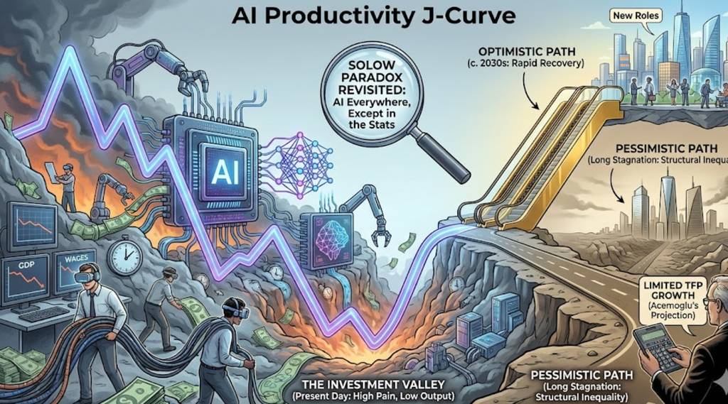 如果AI如此强大,为什么我们没有看到GDP的爆发式增长?为什么我们感受到的只有痛苦?答案在于技术扩散的“生产力J曲线”(Productivity J-Curve)。