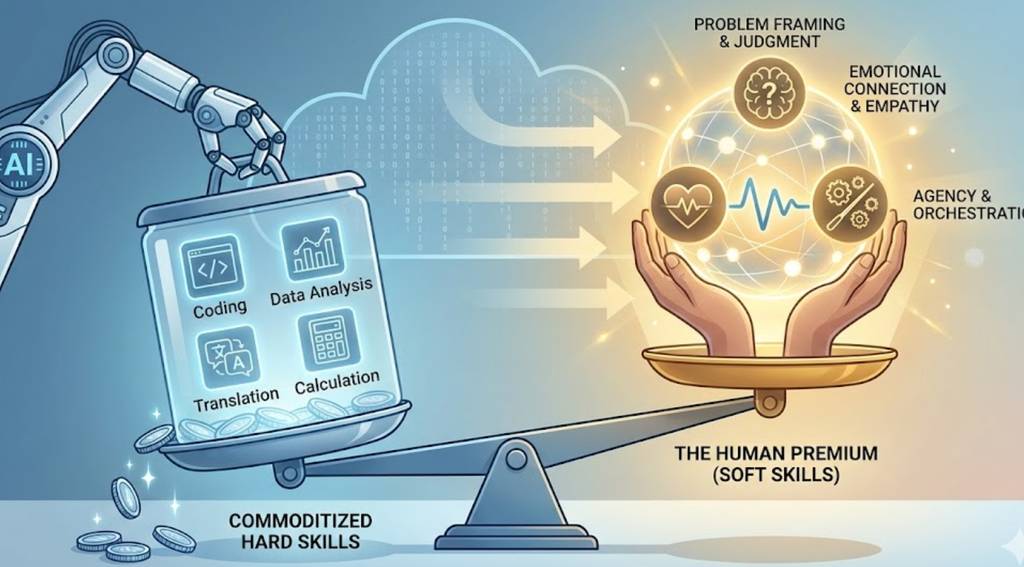 悖论的是,那些曾经被认为是“硬技能”的能力(编程、计算、翻译、数据分析)最容易被AI商品化,而那些难以量化的“软技能”正在获得工资溢价。普华永道(PwC)和世界经济论坛(WEF)的报告均指出,与情感智力、领导力、复杂沟通和同理心相关的技能,其需求增长速度比技术技能快66% 41。