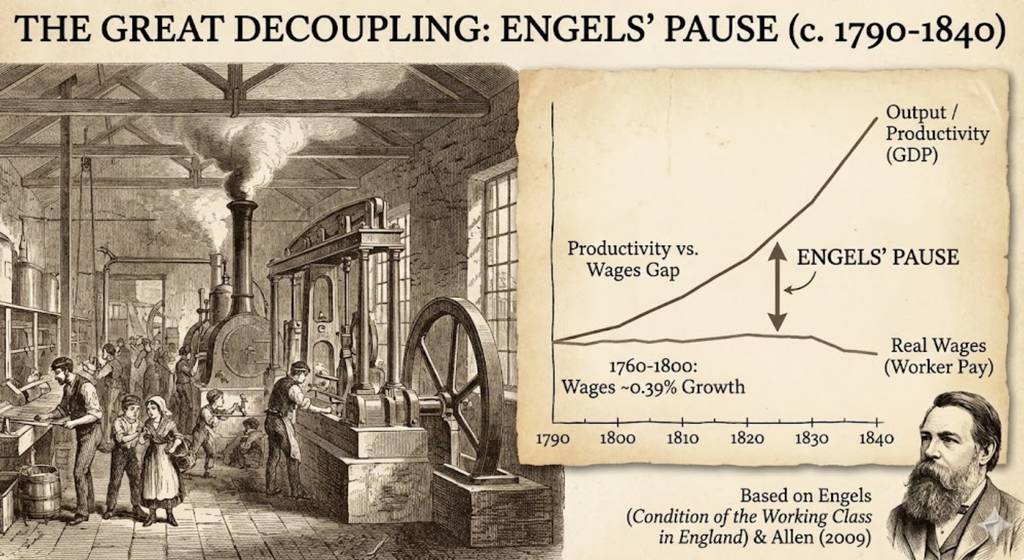 但这真的只是运气的捉弄吗?其实,这种“技术狂飙突进,而普通人生活停滞”的现象,在 200 年前的工业革命中就曾上演过。经济史学家为此起了一个冷峻而精准的名字——“恩格斯停顿”(Engels’ Pause)。