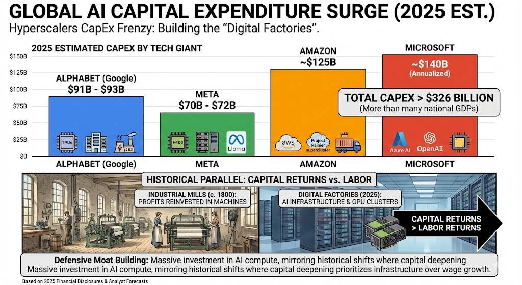 这种支出增长具有明显的“非理性繁荣”特征,或者更准确地说,是一种“防御性护城河构建”。例如,微软的季度资本支出同比增长了74%,达到349亿美元,其中近一半用于购买GPU和CPU芯片 13。这种资金的密集流向明确表明:在当前阶段,资本的回报率(即拥有AI算力的预期回报)被认为远高于劳动的回报率。企业正处于构建“数字工厂”的阶段,这与19世纪初纺织厂主将利润用于购买更多动力织布机而非提高工人工资的行为完全一致。