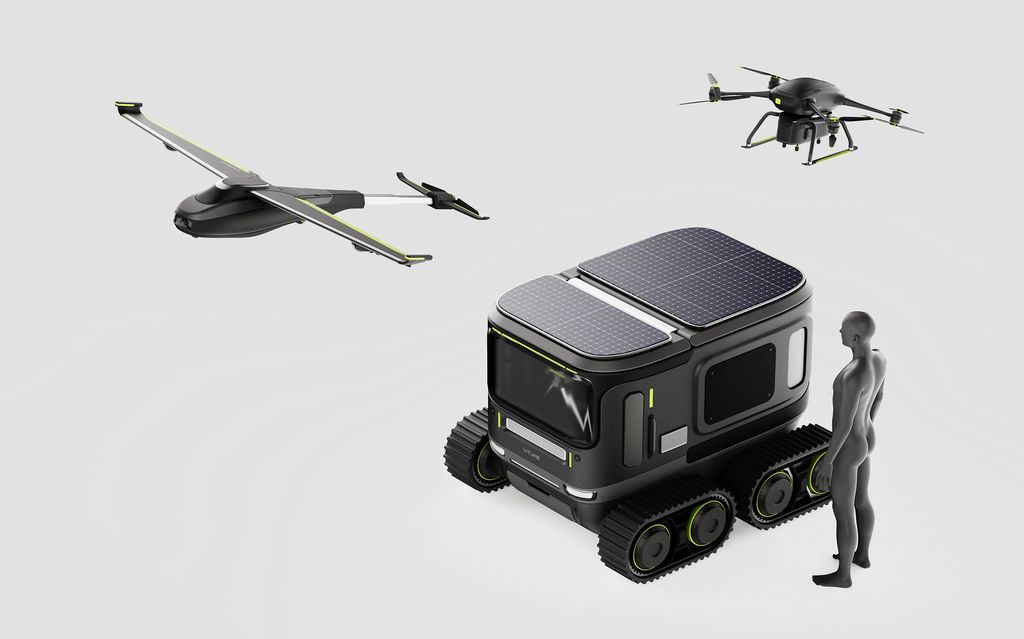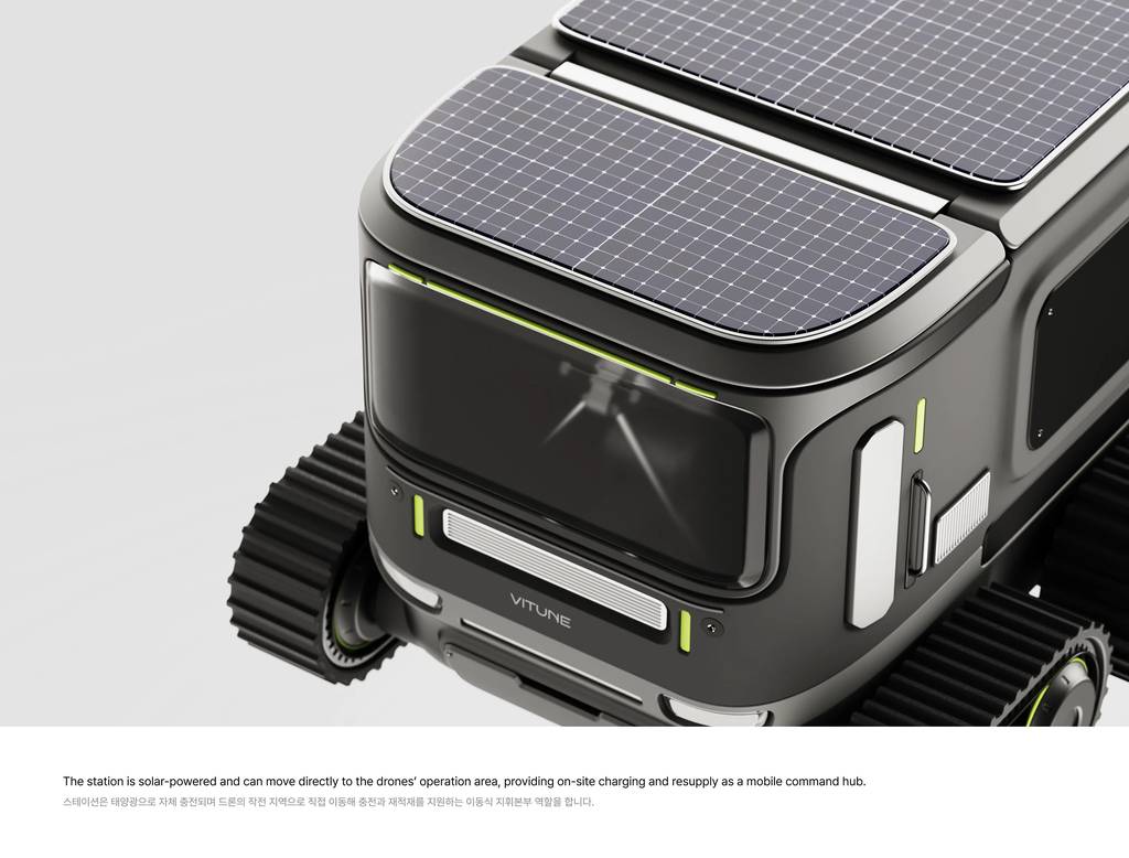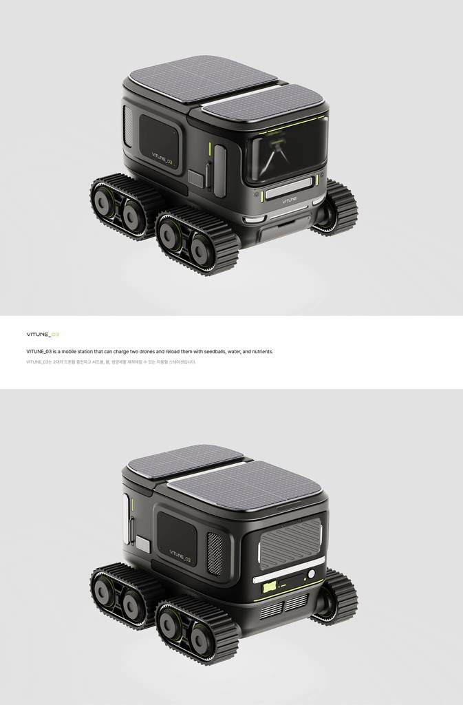 VITUNE_03 移动支持站 VITUNE_03 是一个移动站,可以为两架无人机充电,并重新装载种子球、水和养分。