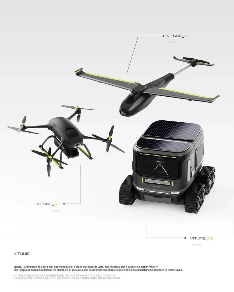 VITUNE 系统 VITUNE 系统由三部分组成:播撒种子球的无人机、供应水和养分的无人机,以及一个移动支持站。这一集成解决方案解决了以往种子球项目的局限性,实现了更高效、可持续的造林方法。